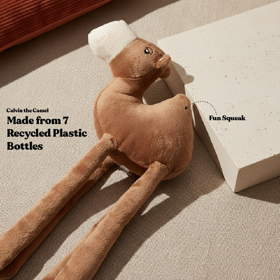 Calvin the Camel is the quirky companion your pup needs! With a squeaker and wiggly dangly legs, Calvin brings tons of fun to playtime. Made from 100% recycled plastic, he's a lovable and eco-friendly playmate.