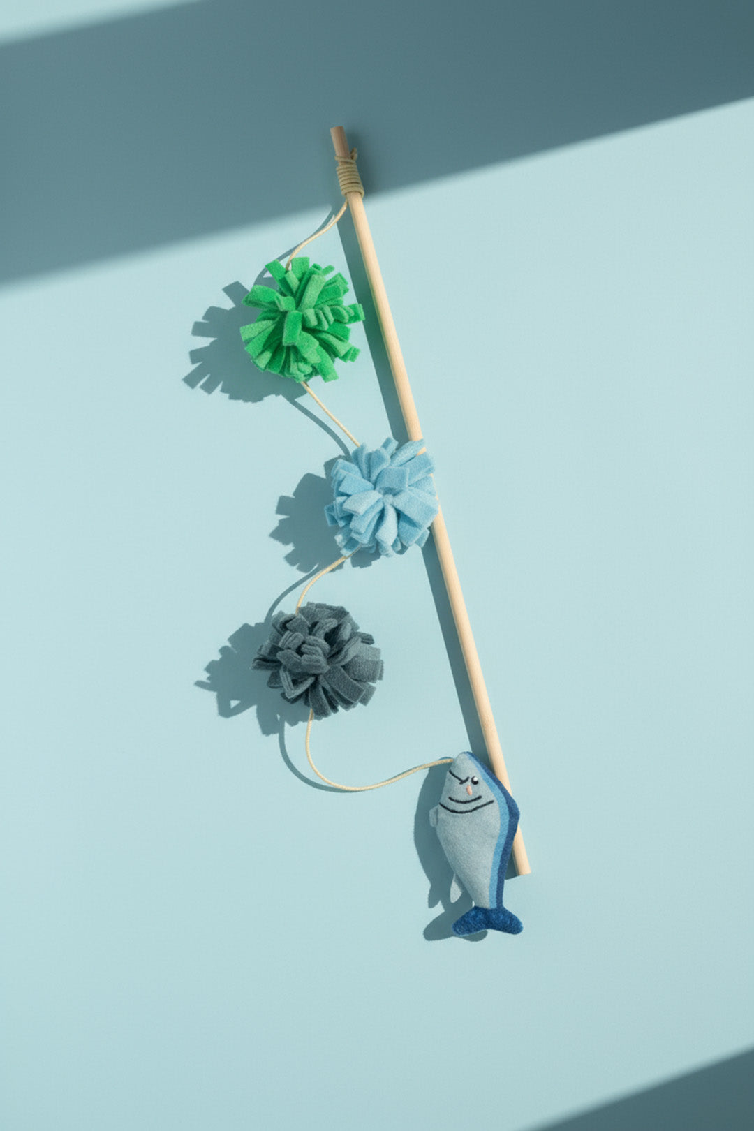Finn the Fish Teaser combines modern design with sustainable materials for an elevated take on classic cat play. Made from 100% recycled plastic bottles, this teaser features soft pom details that create a gentle crinkle sound and a fish charm filled with catnip to keep cats engaged. The clean, coastal color palette adds a refined touch to everyday playtime.