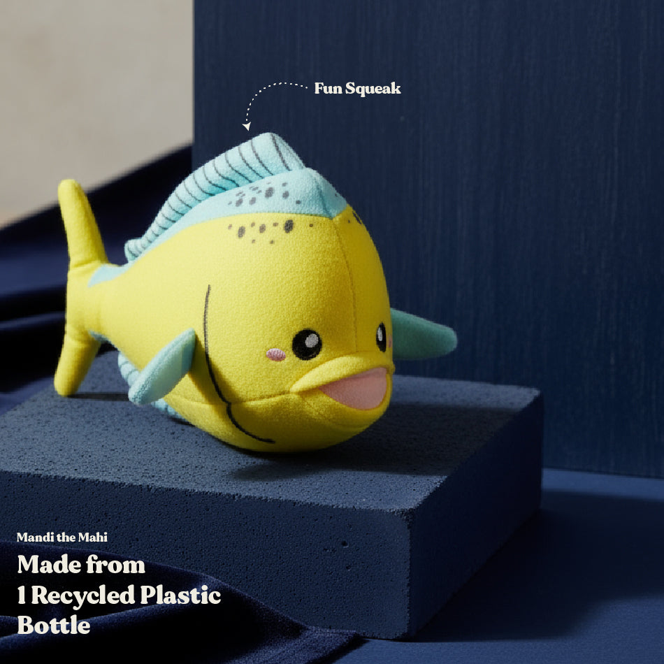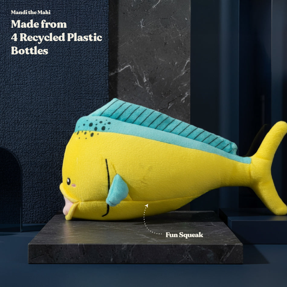 Mandi the Mahi is the catch of the day! With a colorful body and a squeaker for extra fun, this fishy friend is sure to keep tails wagging. Made from 100% recycled plastic, this fin-tastic toy is as fun as it is eco-friendly.