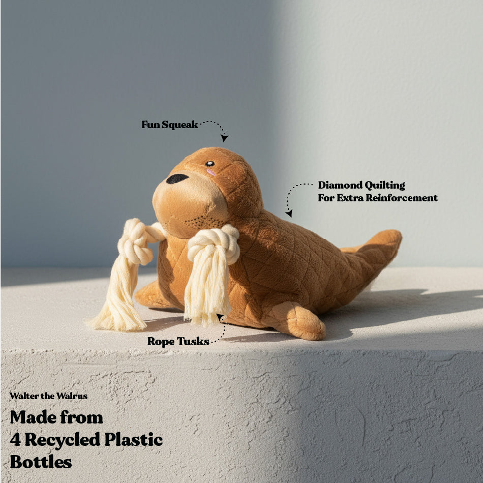 Walter the Walrus is here to make a splash! Featuring a squeaker and rope details, Walter is perfect for tugging and chewing fun. Made from 100% recycled plastic, he's both playful and planet-friendly.